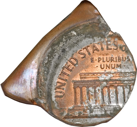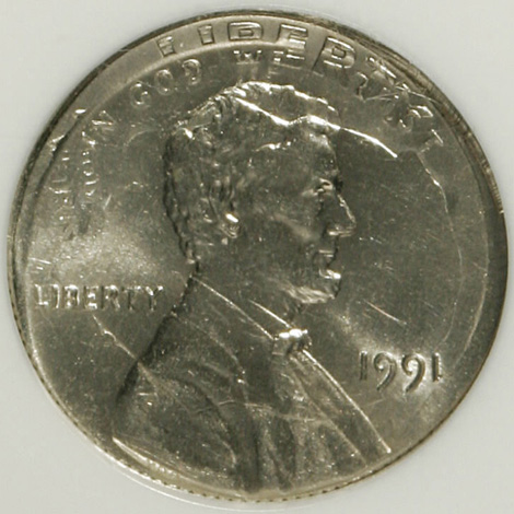 1991 1C Lincoln Cent--Struck 5% Off-Center on a (1991-P) Roosevelt Dime--MS65 NGC