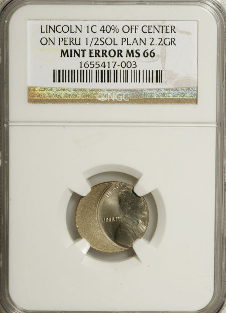 Undated 1C Lincoln Memorial Cent--Struck 40% Off-Center on a Peru Half Sol Planchet--MS66 NGC