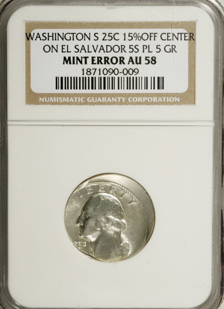 No Date 25C Washington Quarter--15% Off Center, Struck On an El Salvador 5S PL 5 GR--AU58 NGC