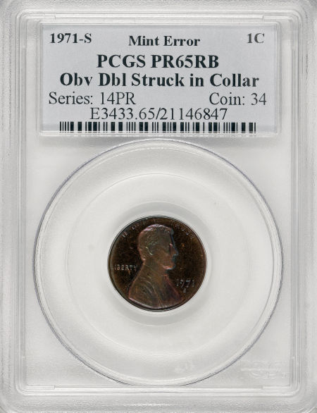 1971-S 1C Lincoln Cent--Obverse Double Struck in Collar--PR65 Red and Brown PCGS