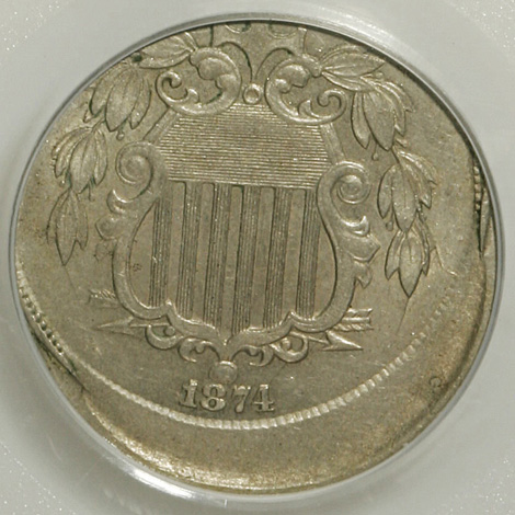 1874 5C Shield Nickel--Struck 20% Off Center--XF45 PCGS