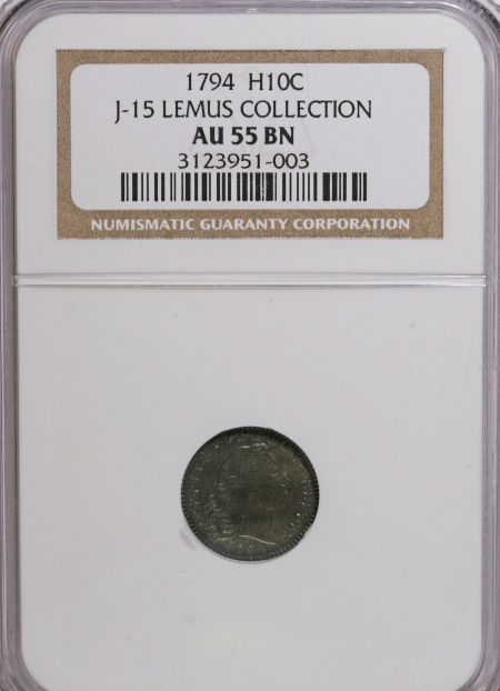 1794 DTH10C Half Dime, Judd-15, Pollock-19, R.8, AU55 NGC
