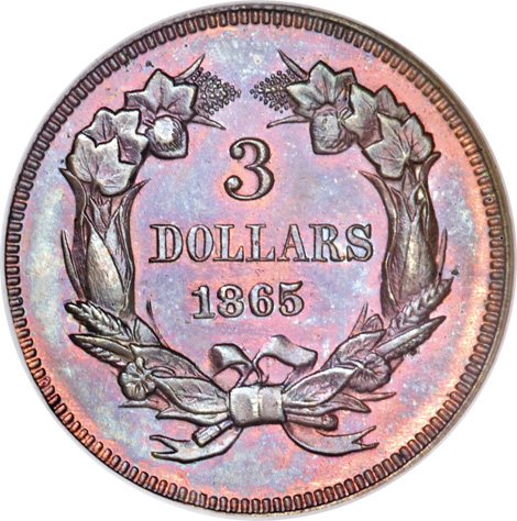 1865 $3 Three Dollar, Judd-443, Pollock-514, R.8, PR64 NGC