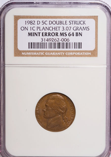 1982-D 5C Jefferson Nickel--Double Struck On Cent Planchet--MS64 Brown NGC