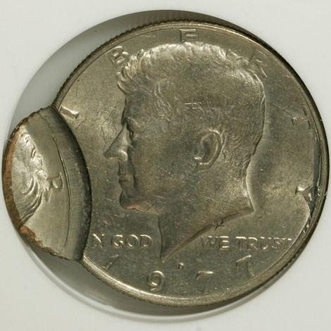 1977-D 50C Kennedy Half--Double Struck, Second Strike Off Center--AU58 NGC