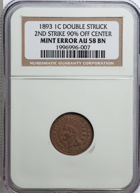 1893 Indian Cent--Double Struck 2nd Strike 90% Off-Center--AU58 NGC