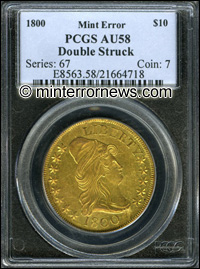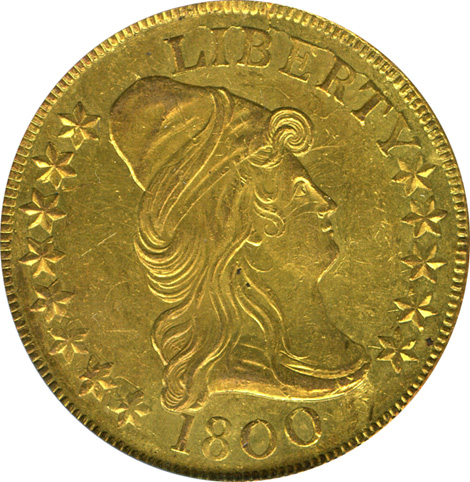 1800 $10 --Double Struck--AU58 PCGS. B. 1-A, Taraszka-23, Breen-6842, R.4. Only 5,999 pieces were struck of the 1800 ten dollar, making it a scarce date among early gold coins. Apparently the dies were retired after a die crack developed above LIBERTY on the upper obverse. That crack is especially noticeable on this piece, which would indicate that this was among the last coins struck in 1800. But what is most remarkable about this coin is not the date or even the grade, but the double striking seen on each side. This is not machine doubling that is commonly seen on early type coins. This piece was struck once, then the struck coin rotated almost 180 degrees and it was struck a second time. Traces of the first strike are plentiful on each side, but the most obvious ones are portions of LIBERTY to the right of the stars and through stars 1-5, and on the reverse the UNU of UNUM is boldly impressed in the horizontal shield stripes.