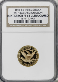 1891 $5 --Triple Struck with Reverse Rotation--PR64 Ultra Cameo NGC. This rare proof half eagle was struck at least three times by the dies. Of course, all proof Liberty fives were multiple struck, to bring out complete definition. What makes the present piece an error is that the hammer (reverse) die was apparently loose, and rotated a couple of degrees between strikes. The anvil (obverse) was stationary. As a result, the obverse shows no evidence of a multiple strike, but the reverse has faint rotated impressions from the prior two strikes. These are most apparent above the eagle’s right (facing) shoulder, and southwest of the eagle’s beak. For the final strike, the dies were close to medal turn. The devices are fully frosted, and contrast greatly with the darkly mirrored fields. Hair-thin field imperfections near the date, star 10, and the neck curls are all that limit the grade. A mere 53 proofs were struck, and perhaps half that number have survived. The NGC and PCGS population data are undoubtedly inflated by resubmissions over the past 22 years. Census: 4 in 64 Ultra Cameo, 9 finer (1/08).