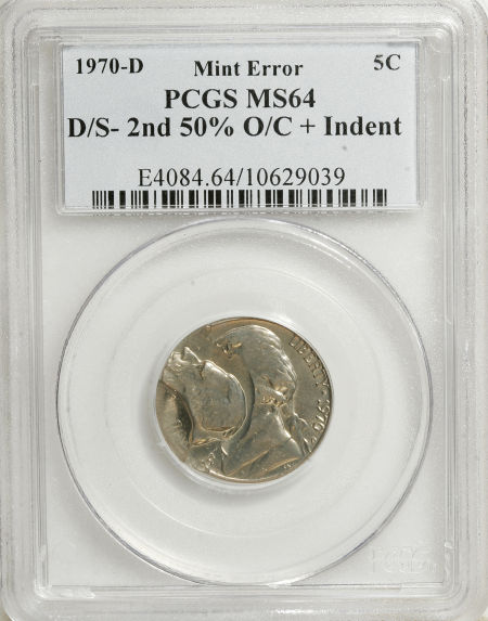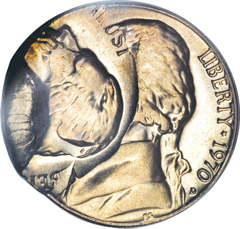 1970-D Jefferson Nickel--Double Struck, 2nd Strike 50% Off Center With Indent--MS64 PCGS