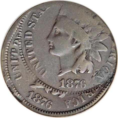 1876 Indian Cent--Double Struck, 25% Off Center, Scratched--NCS. VG Details
