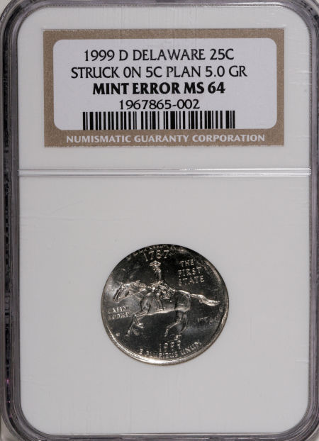1999-D 25C Delaware Statehood Quarter--Struck on a Five Cent Planchet--MS64 NGC