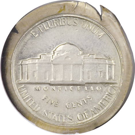 1979 Jefferson Nickel--Struck 5% Off Center on a Cent Planchet--MS65 Red and Brown--PCGS