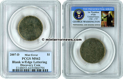 This type two (raised rim) planchet somehow made it to the final stage of the Presidential dollar minting process without being struck or burnished. The incuse edge lettering is complete with the date, mintmark and the two mottos, In God We Trust and E Pluribus Unum.