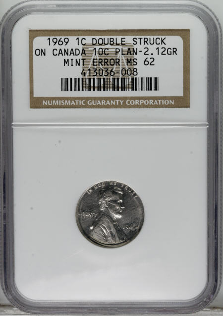 1994-P Lincoln Cent--Struck on 1969 Denver Dime