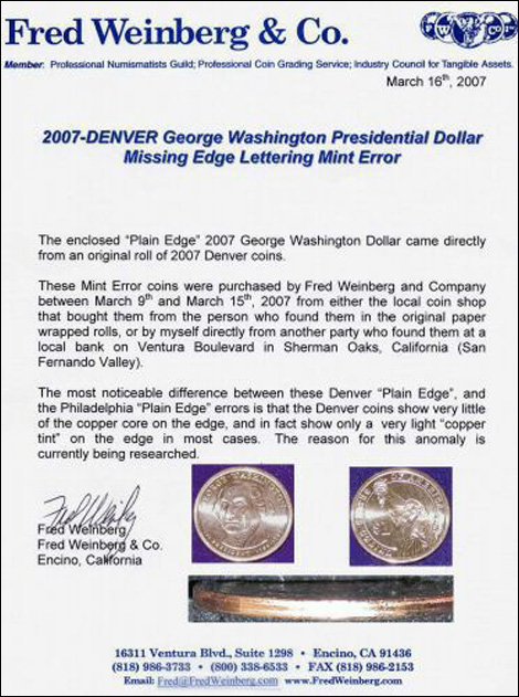 Editor’s Note: Well known Mint Error Dealer, Fred Weinberg, recently purchased a group of 2007 Denver Washington Dollar “Missing Edge Lettering” mint errors. Here is a quote from Fred as well as his authentication letter that he included with each sale.
