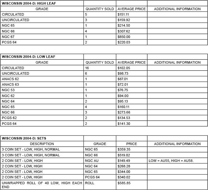 Last quarter I reported that the low and high leaf Wisconsin quarters were selling around the same price level. This quarter, prices have stayed steady. Still, hundreds of these listed remain unsold. The High Leafs are suppose to be the rarest. The price variance between the high and low are very close if sold raw. Note: Low Leaf raw coins. The uncirculated sold for less than the circulated. Someone got the idea to place a high and low on each side of a bank wrapped roll. Check out the price someone paid!