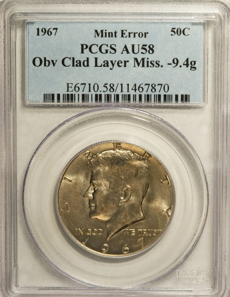 1967 50C Kennedy Half--Obverse Clad Layer Miss.-9.4g--AU58 PCGS