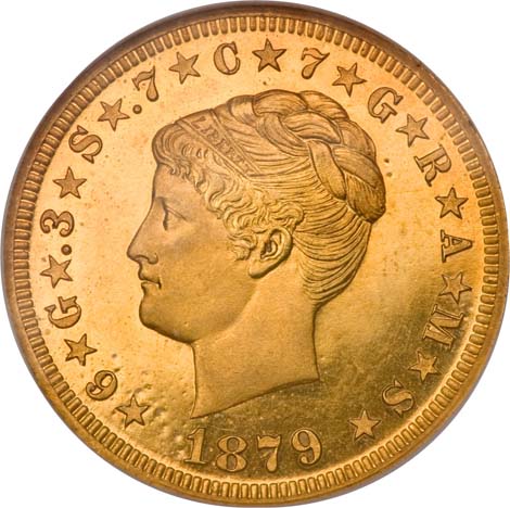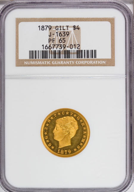 1879 $4 Coiled Hair Four Dollar, Judd-1639, Pollock-1839, Low R.7, PR65 Gilt NGC