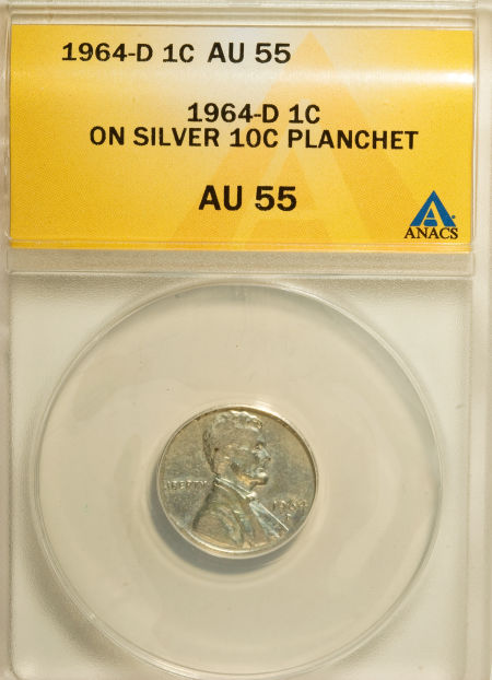 1964-D 1C Lincoln Cent--On Silver 10C Planchet--AU55 ANACS