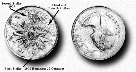 A most spectacular multiple error. This coin has been struck 4 times! Coinage for Honduras has been produced by Canada since 1973. In 1979 30,000,000 Cupro Nickel Twenty Centavos were struck (Dated 1978).