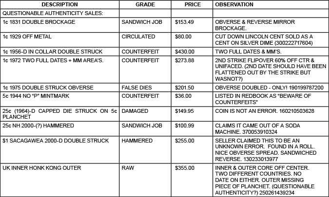 THE FOLLOWING GROUP REPRESENTS COINS SOLD ON EBAY AS ERRORS. IN MY OPINION THIS GROUP CONSISTS OF VERY QUESTIONABLE AUTHENTICITY OF STATED ERROR. SOME COINS MAY BE LEGITIMATE ERRORS BUT HAVE BEEN MATED WITH A SECOND COIN TO CREATE A SECOND SCARCER DOUBLE ERROR. QUITE A FEW OF THESE ARE PRESENTED ON A DAILY BASIS, BUT THE PRICE REALIZED KEEPS ME FROM LISTING THEM HERE. (THERE ARE COLLECTORS THAT WILL BUY COUNTERFEITS AND PAY BIG MONEY.)