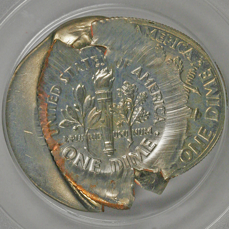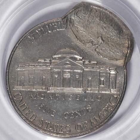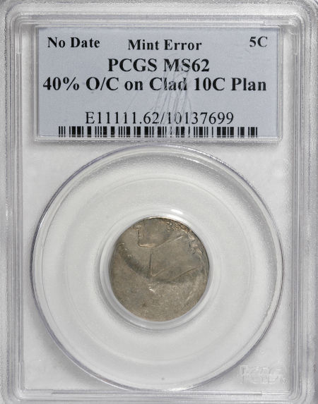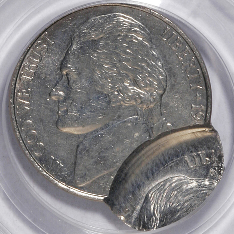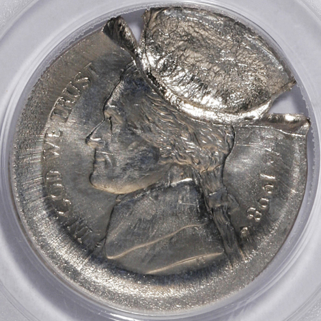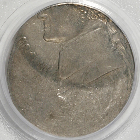 Undated Jefferson Nickel--Struck 40% Off-Center on a Clad Dime Planchet--MS62 PCGS