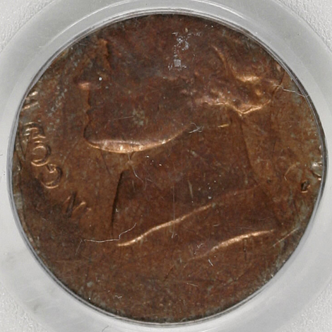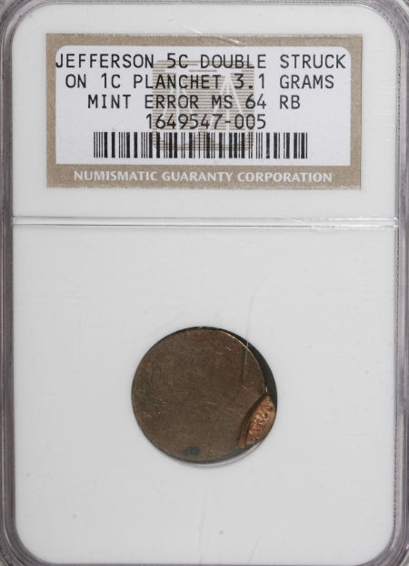Undated Jefferson Nickel--Struck Twice on a Cent Planchet--MS64 Red and Brown NGC