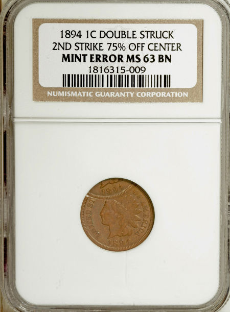 1894 Indian Cent--Struck Twice, Second Strike 75% Off-Center--MS63 Brown NGC