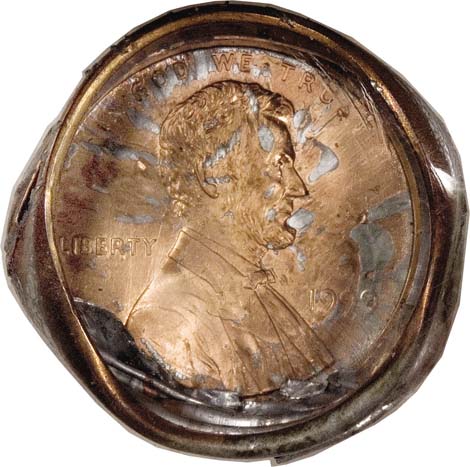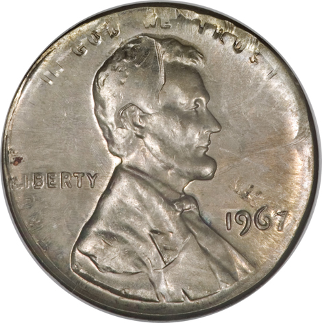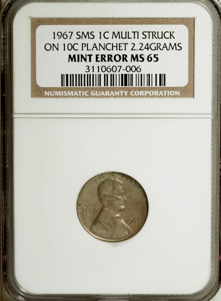 1967 SMS Lincoln Cent--Struck Multiple Times on a Dime Planchet--MS65 NGC
