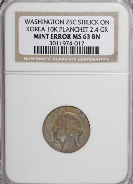 Undated Washington Quarter--Struck on a Korean 10 Hwan Planchet--MS63 Brown NGC