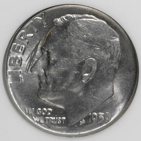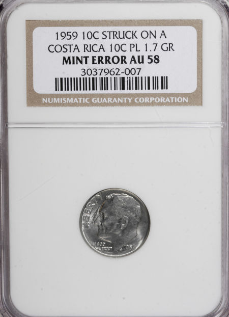 1959 Roosevelt Dime--Struck on a Costa Rica 10 Centimos Planchet--AU58 NGC
