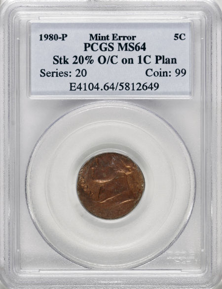 1980-P Jefferson Nickel--Struck 20% Off Center on a Cent Planchet-- MS64 PCGS