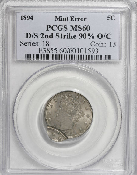 1894 Liberty Nickel--Double Struck, Second Strike 90% Off Center--MS60 PCGS