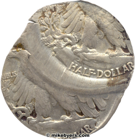This Walking Liberty Half was struck at the San Francisco Mint on a U.S. Silver Quarter planchet. It failed to eject, remaining in the collar and was struck again 50% off-center. Another blank was resting on the off-center portion on the obverse during the second off-center strike.