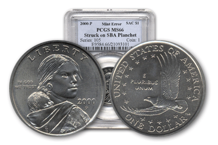 There are also transitionals struck on blanks for the next year. An example is 1964 coinage in clad instead of silver. Most recently, transitionals were discovered involving the SBA and Sacagawea Dollars of 1999 and 2000. There are eight known 1999 SBA Dollars struck on the brass planchet for the 2000 Sacagawea Dollar, and four known 2000 Sacagawea Dollars struck on a clad planchet for the 1999 SBA Dollar.